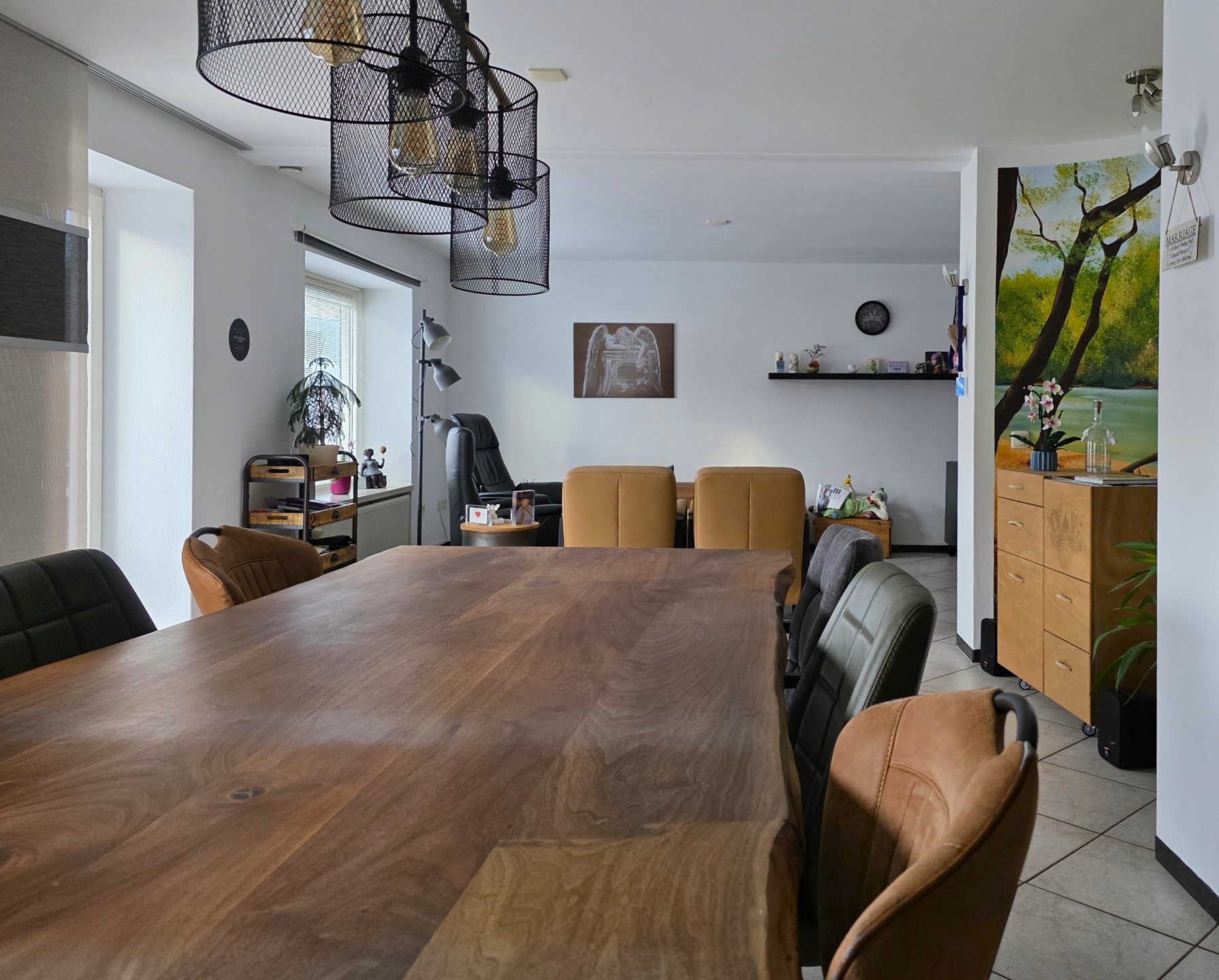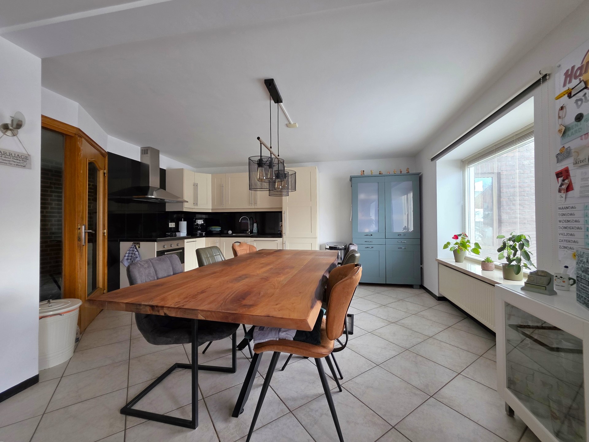 Links van de hal kom je gelijk binnen in de ruime eetkamer met open keuken in hoekopstelling, waar alle ruimte is om gezellig met vrienden te kunnen eten.
