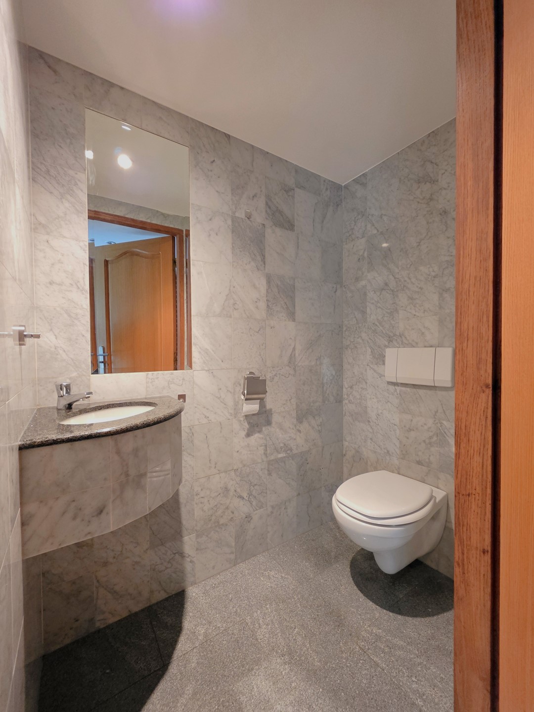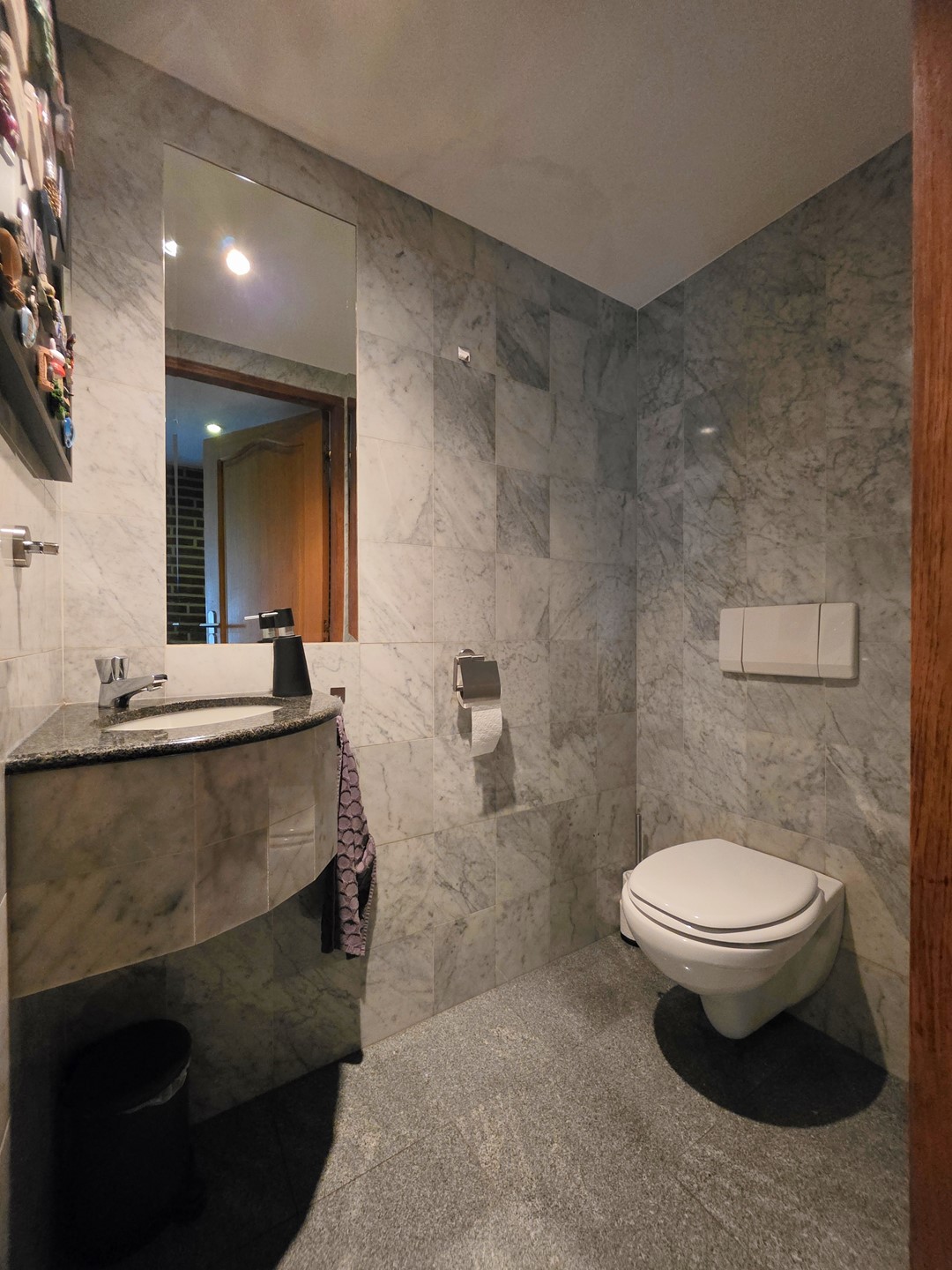 De keuken is dan ook compleet uitgerust met een granieten aanrechtblad, RVS-afzuigkap, inbouw -kookplaat, -vaatwasser, -oven, -koelkast en -vriezer.