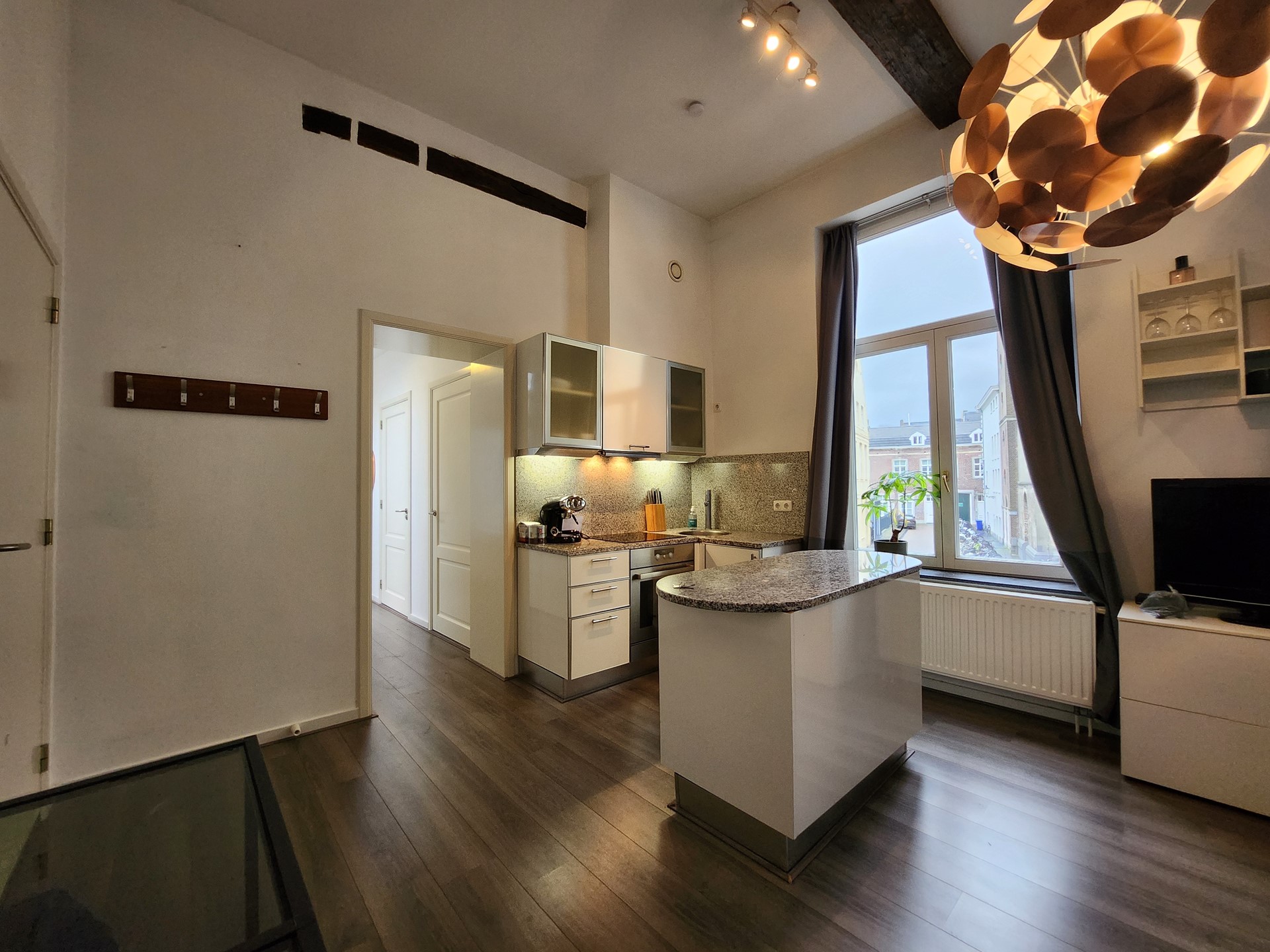 Appartement: Als bewoner kom je gelijk binnen in de ruime woonkamer met hoge plafonds met oude houten steunbalken. De luxe open keuken is v.v. een granieten blad, inbouwoven, inbouwkoelkast met vriezer, inbouw afzuigkap, vaatwasser en 4 pits kookplaat).