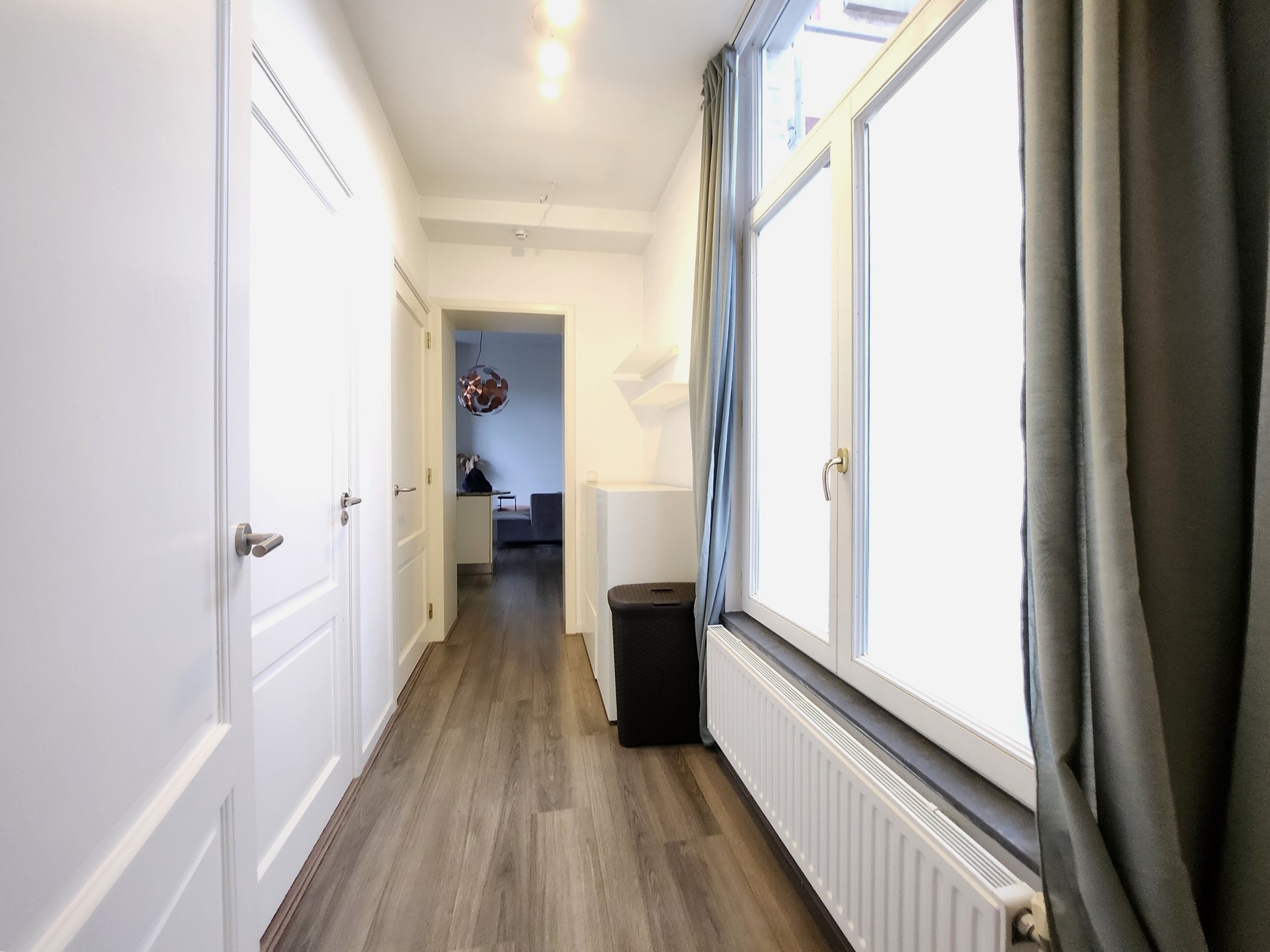 Het appartement kenmerkt zich door de hoge plafonds en grote raampartijen met veel lichtinval.
