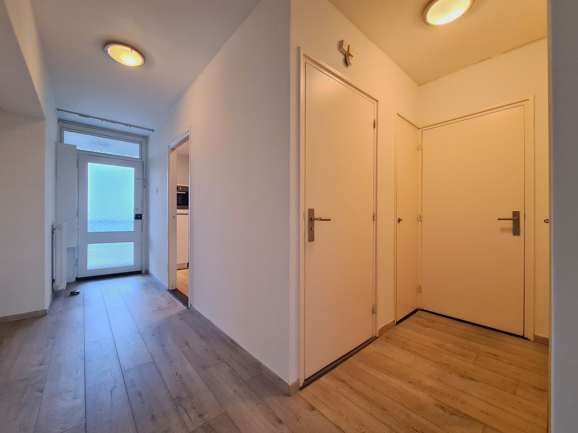 Op het einde van de galerij is de voordeur van dit goed ingedeelde appartement. Bij binnenkomst in de royale, L-vormige hal vind je toegang tot nagenoeg alle ruimtes.
