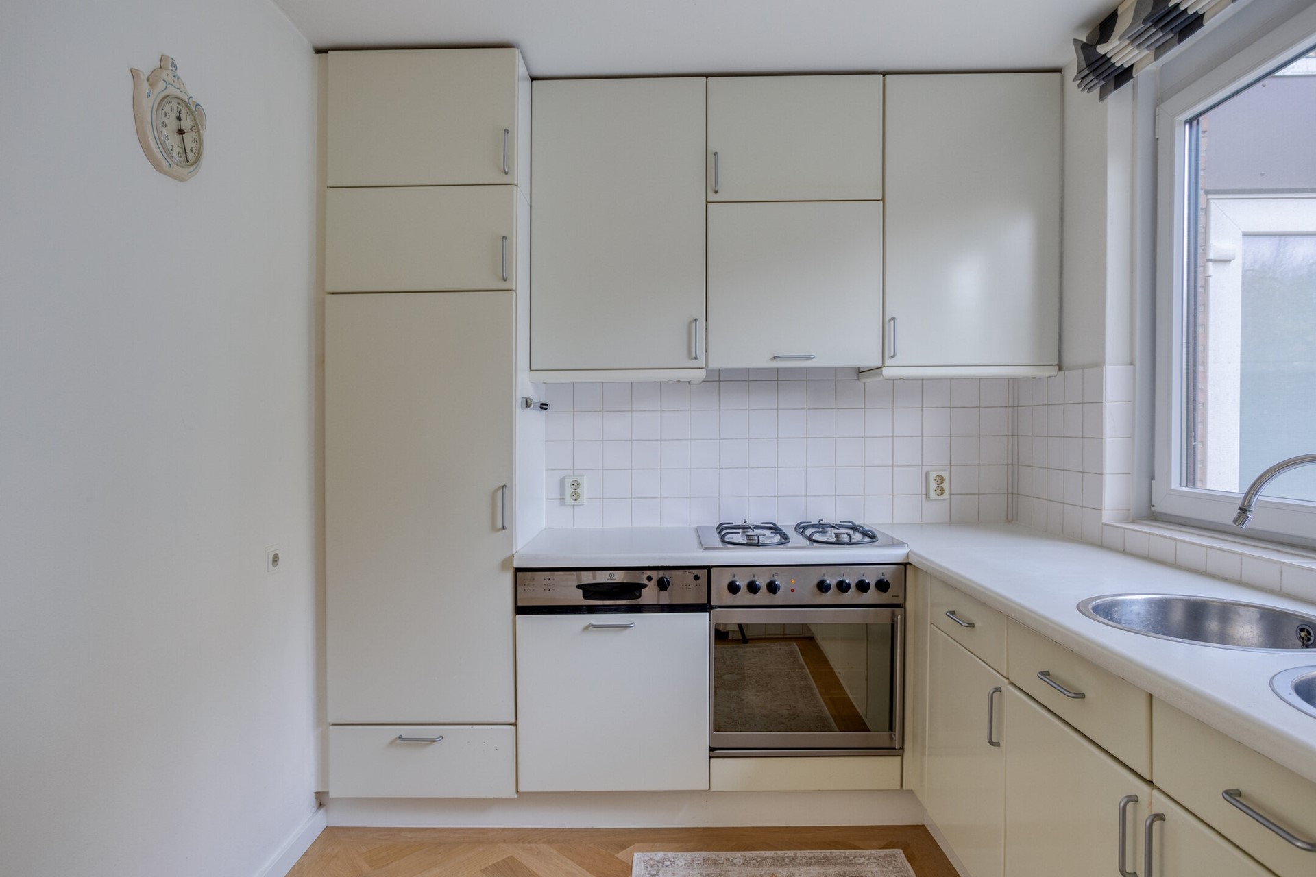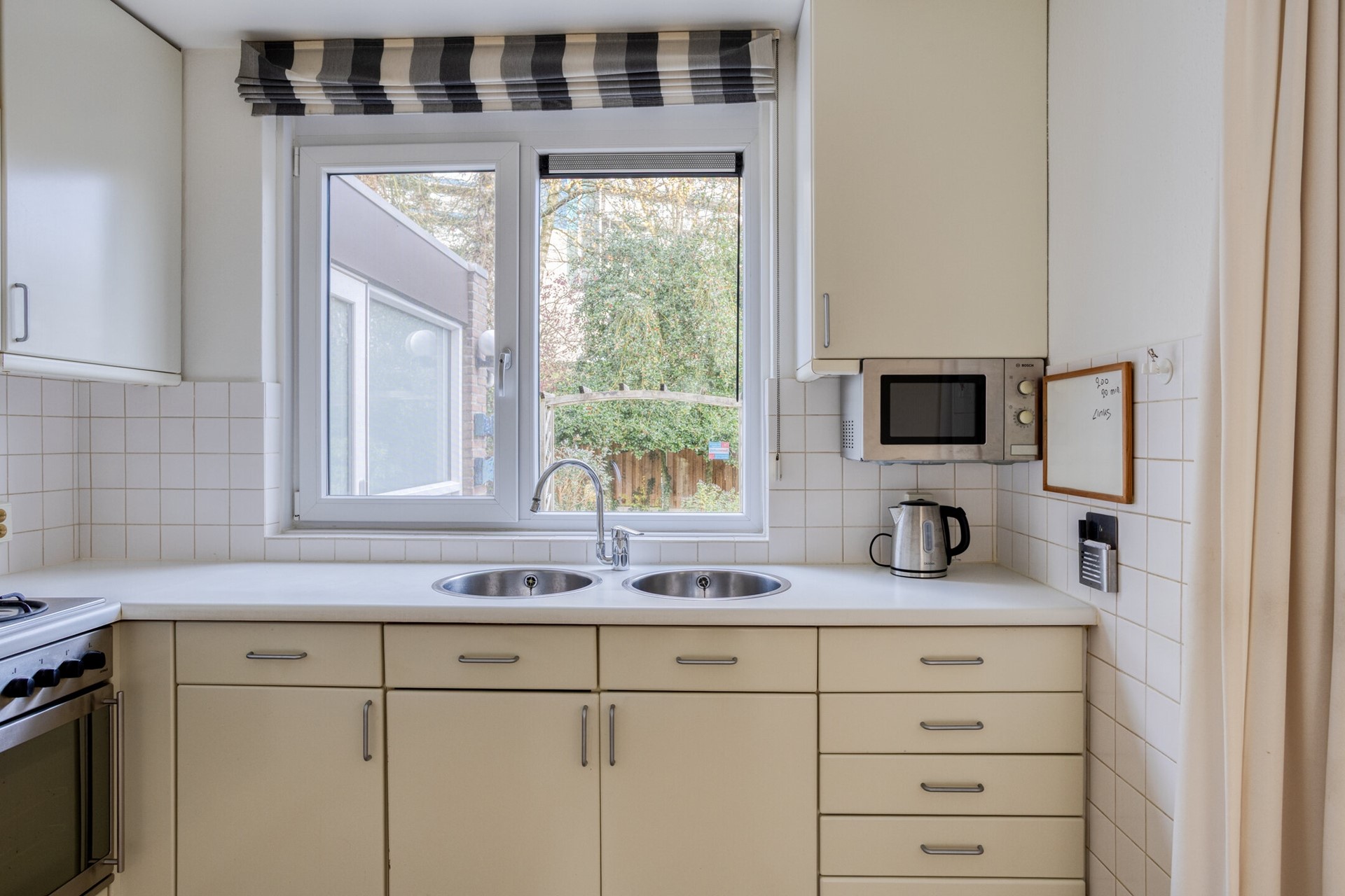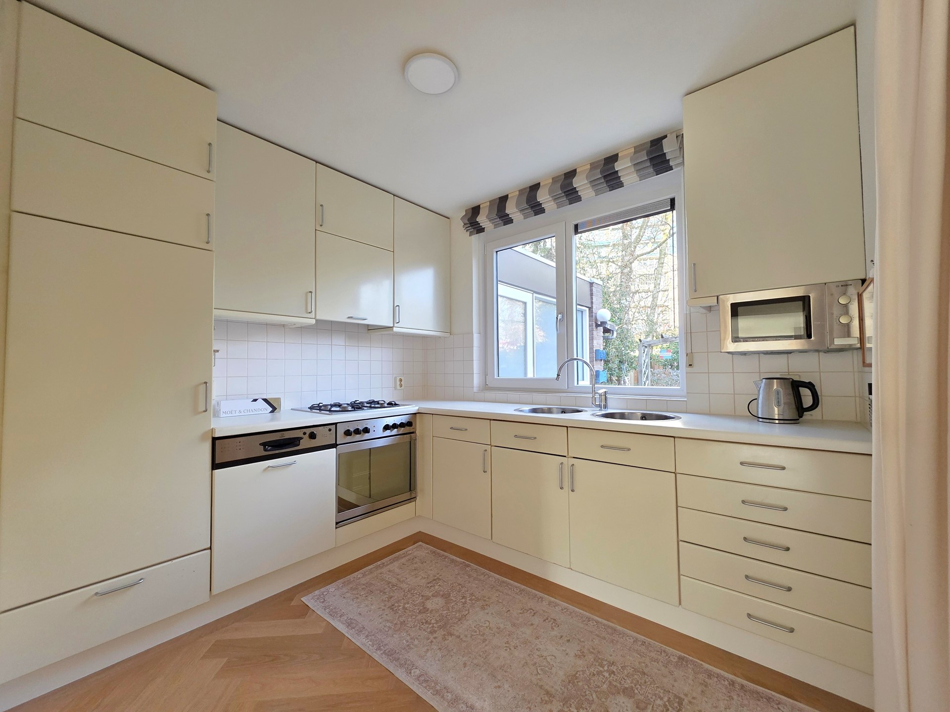 De keuken is ietwat gedateerd maar netjes onderhouden en voorzien van een koelkast met diepvries, oven, 4-pits gaskookplaat, inbouw afzuigkap, dubbele wasbak en vaatwasser. Tevens is er een bergkast naast de keuken gesitueerd, ideaal voor proviand.