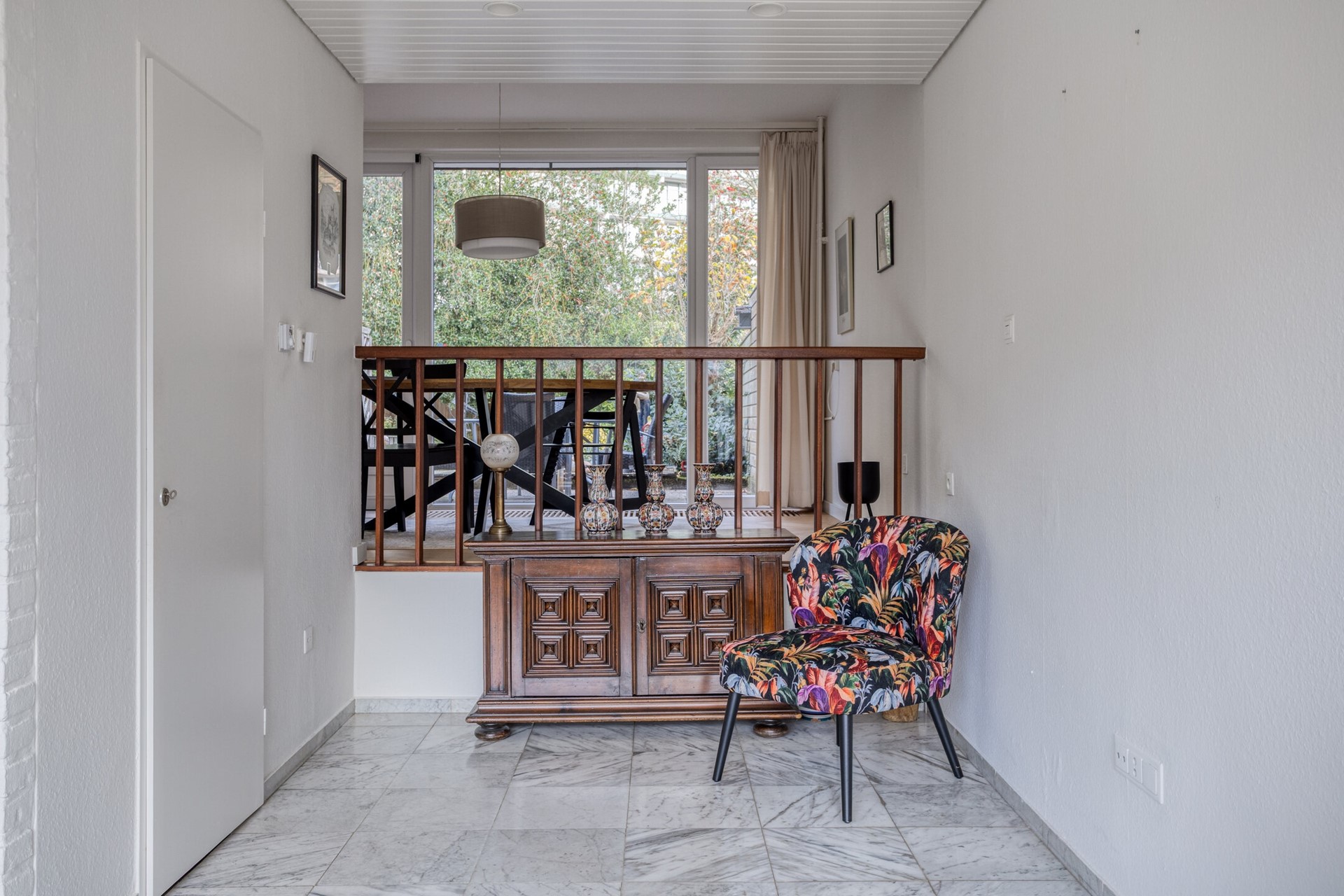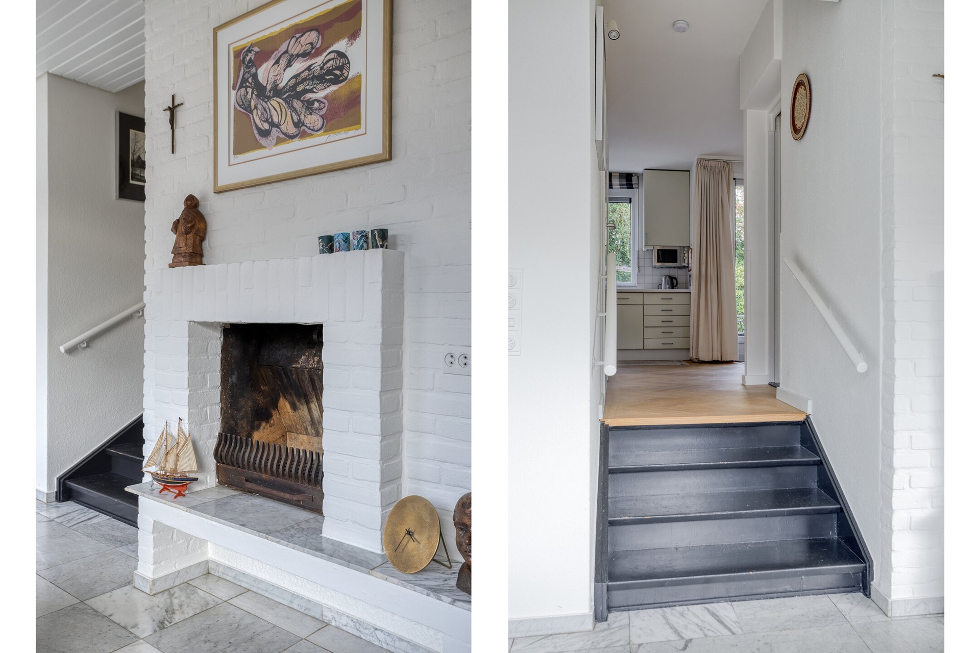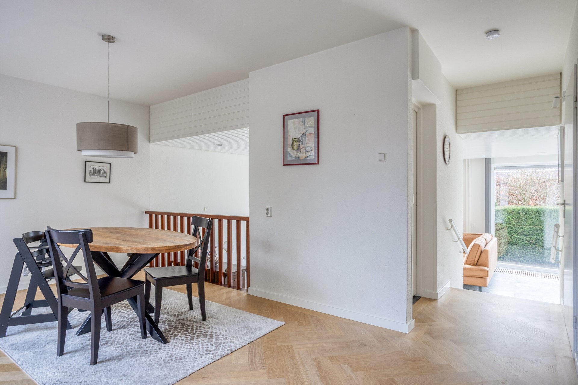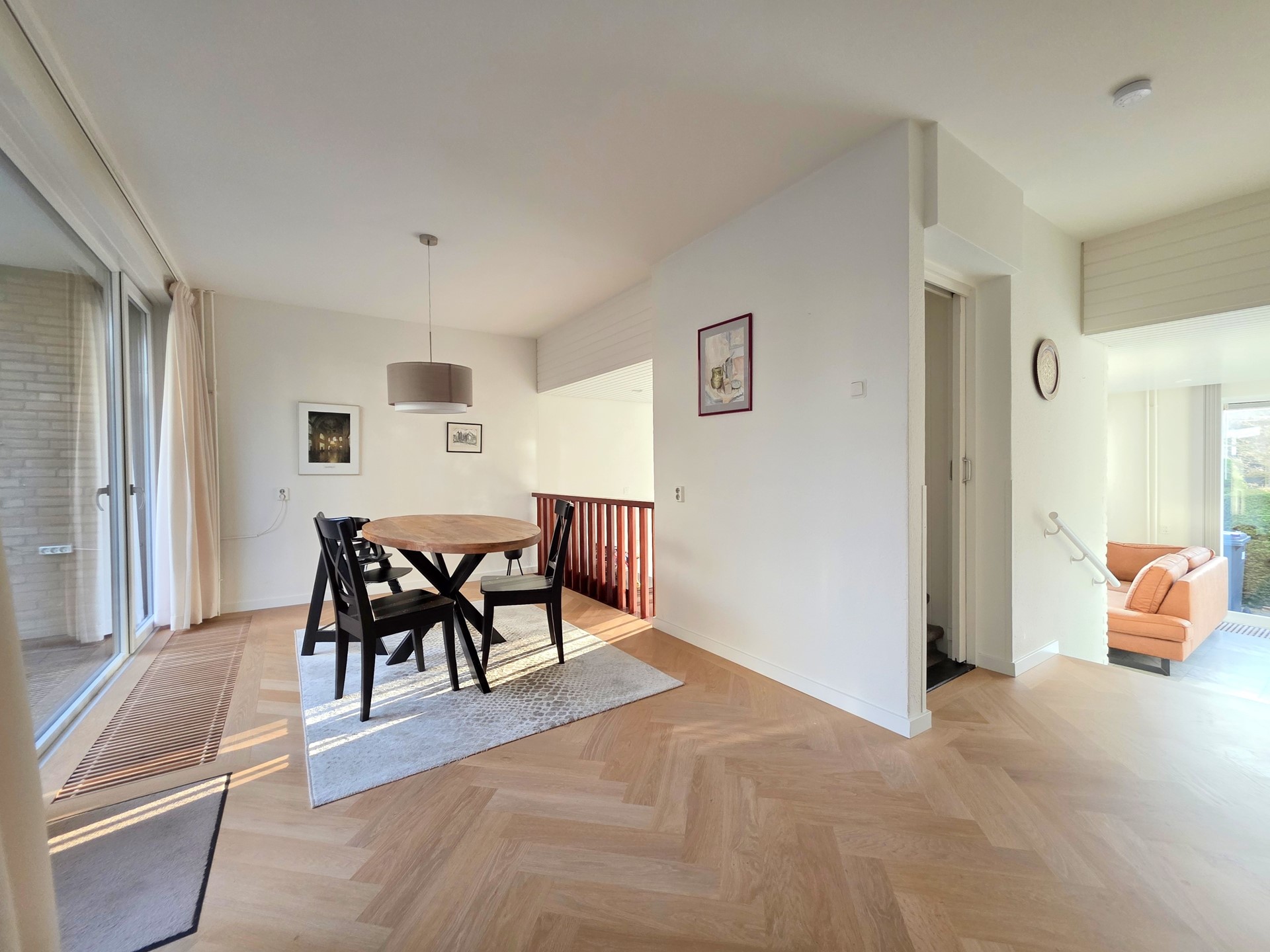 Bij binnenkomst valt gelijk de speelse split-level indeling op en de grote hoeveelheid daglichttoetreding, met aan je linkerhand de keuken en eetkamer en aan de rechterzijde de woonkamer.
