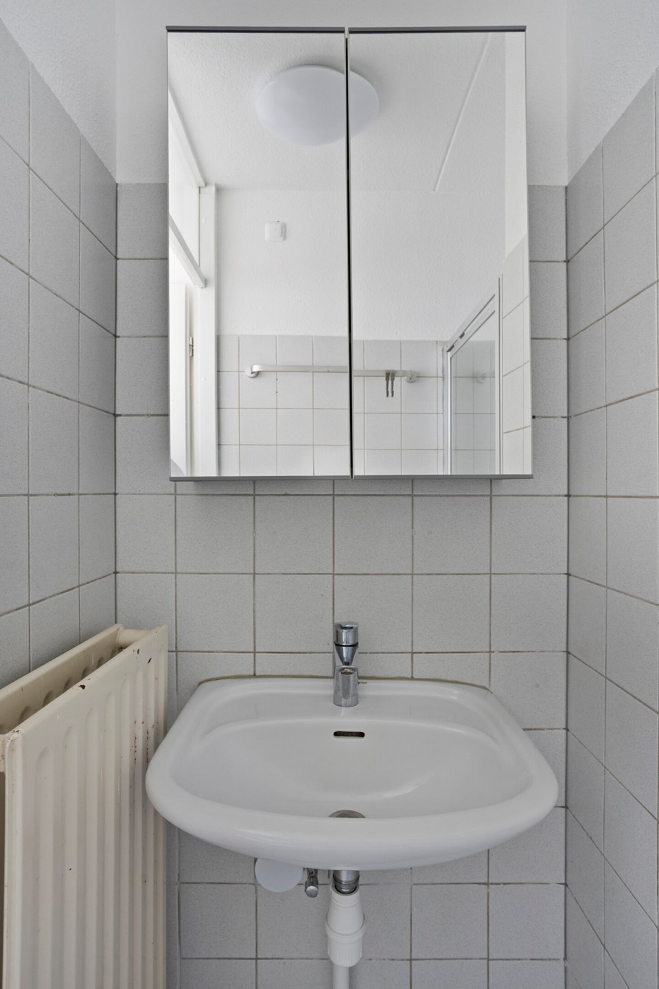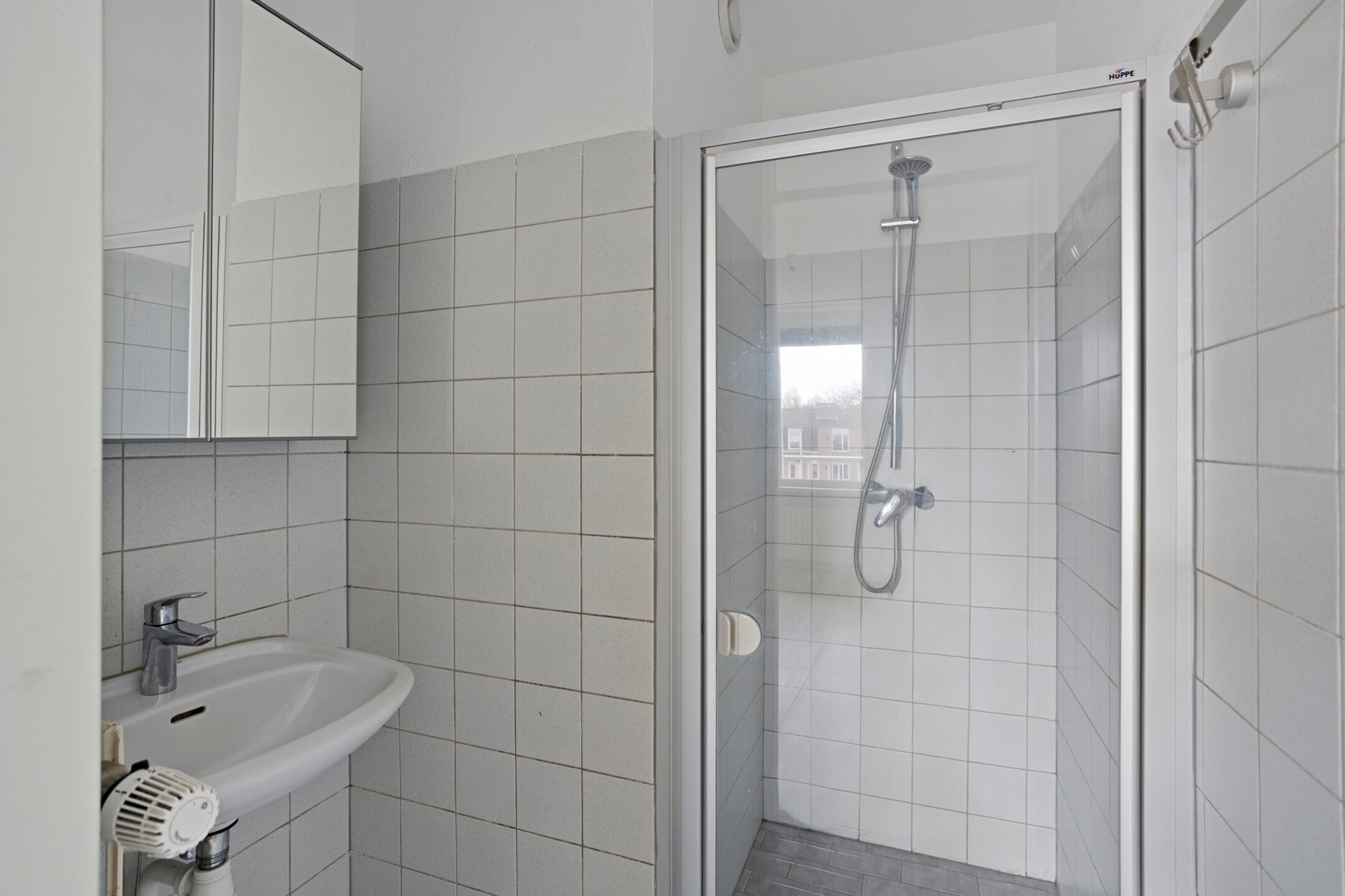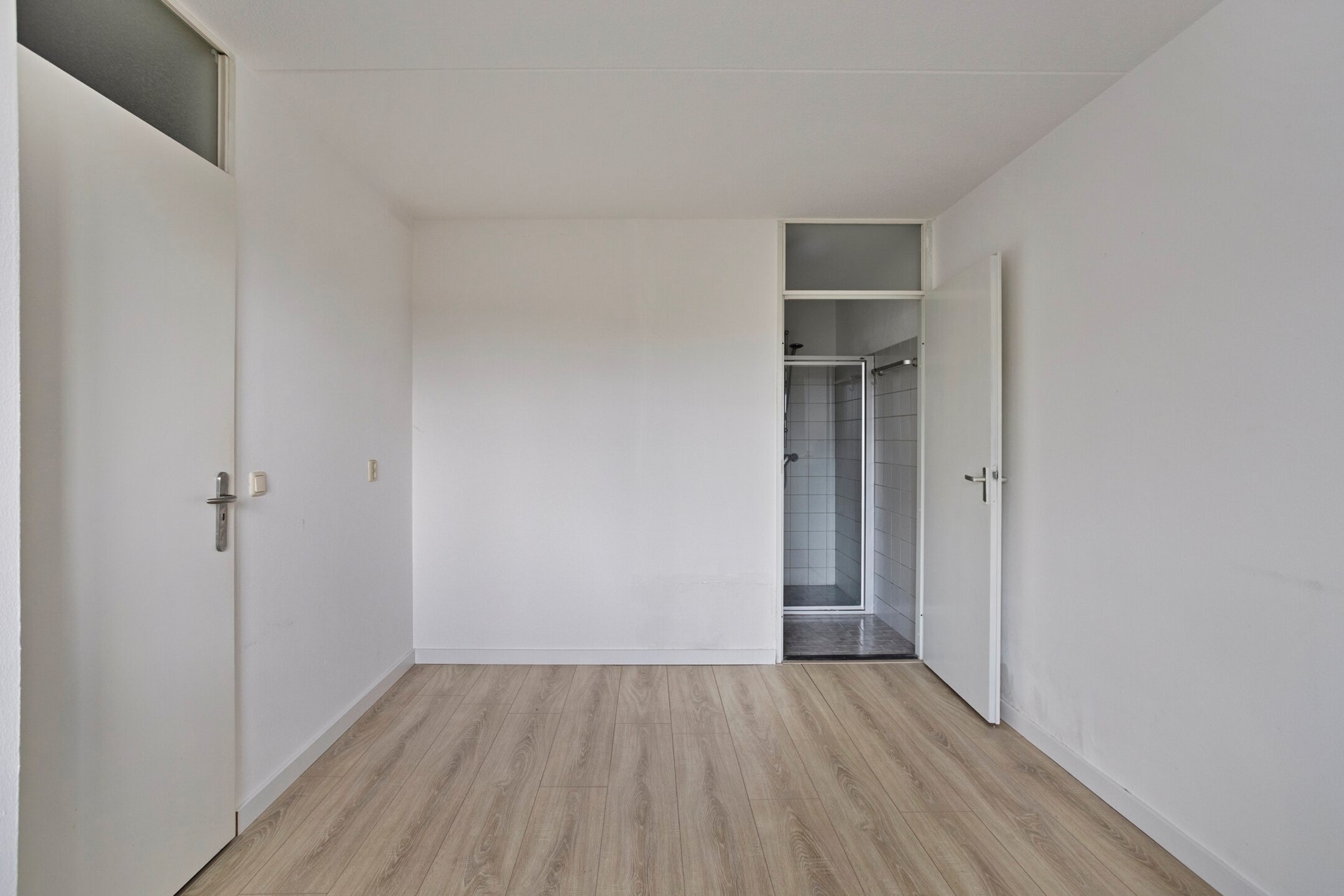 De slaapkamer is voorzien van houten kozijnen met isolerende beglazing laminaatvloer. Via de slaapkamer bereik je de eenvoudige badkamer, geheel betegeld en voorzien van een inloopdouche en wastafel met spiegelkast.