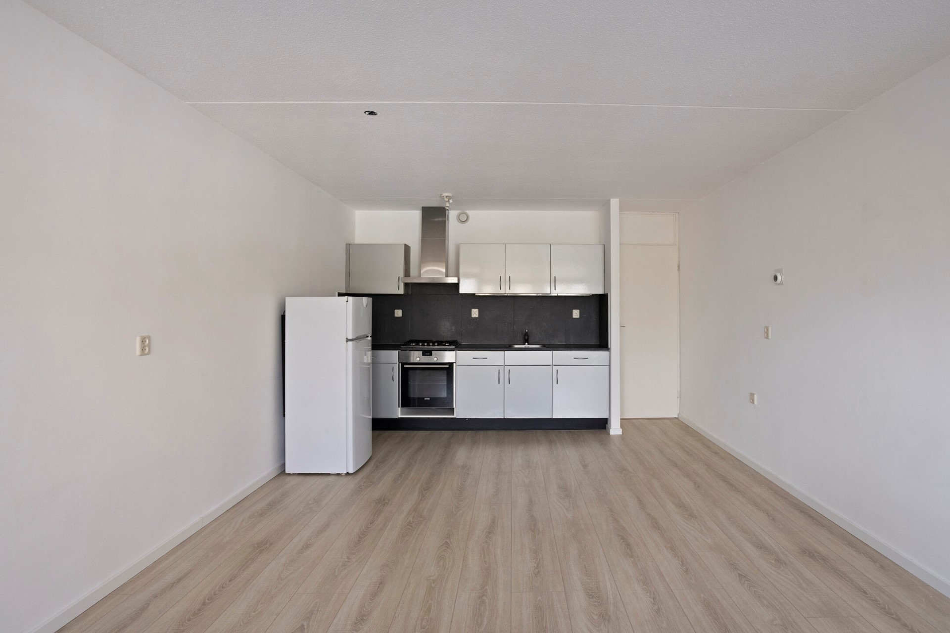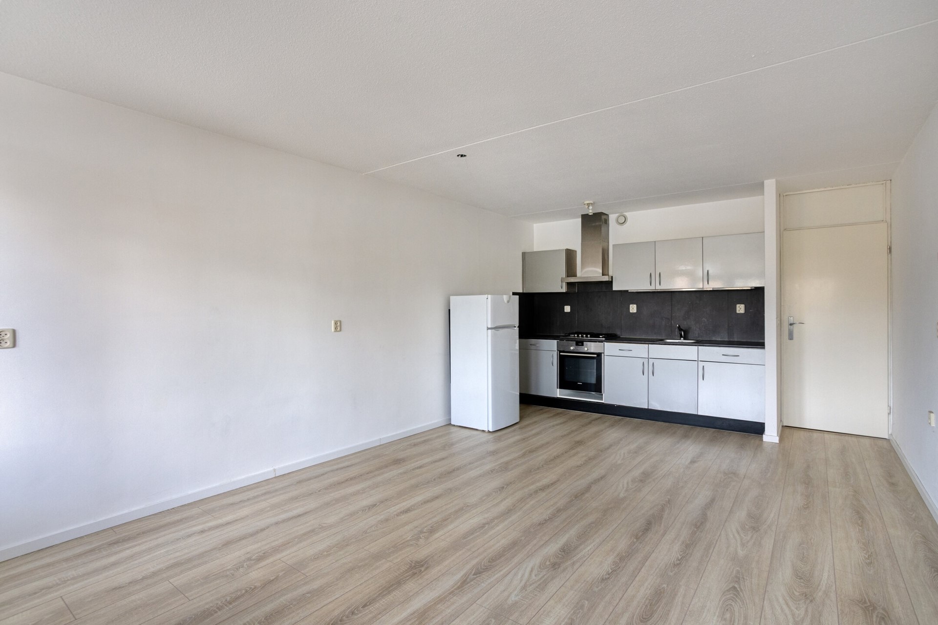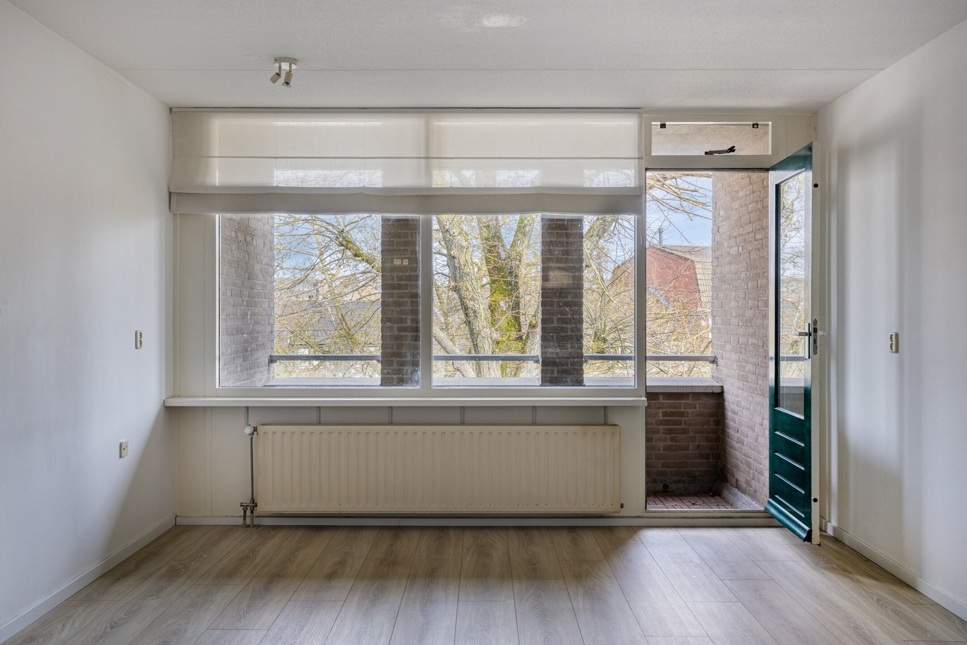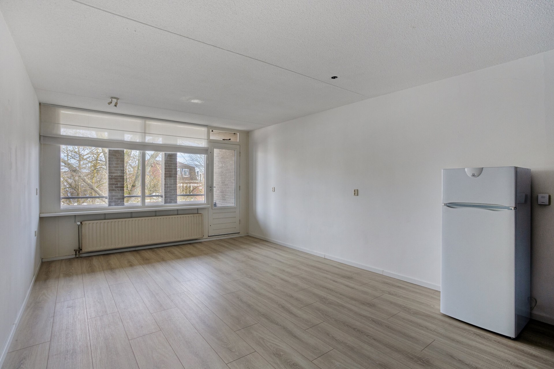 De woonkamer met open keuken geniet van veel lichtinval door de velen ramenpartijen aan de straatzijde en geeft toegang tot het balkon.