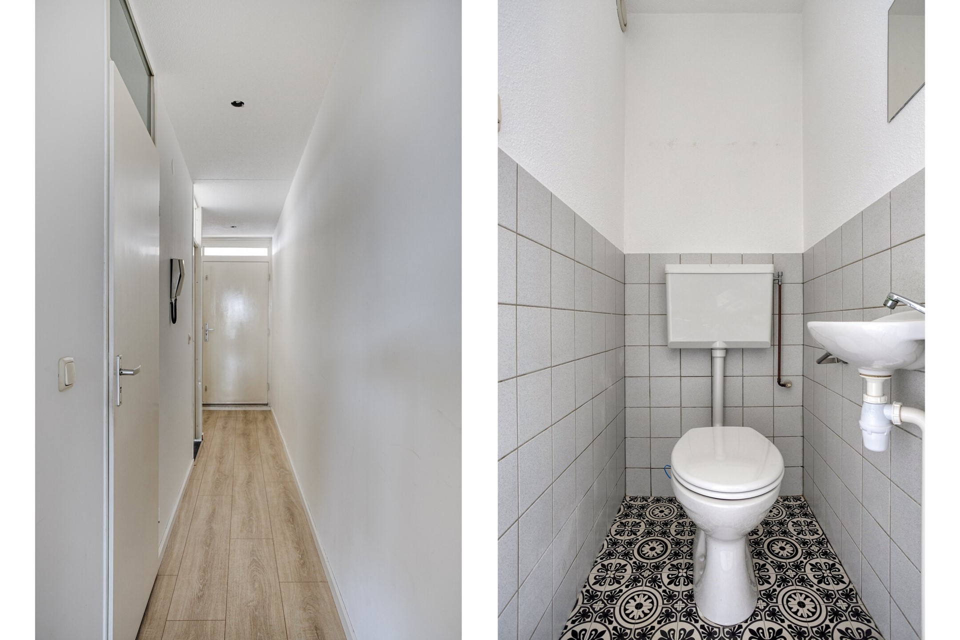 Separaat toilet, voorzien van een wandcloset en een fonteintje.